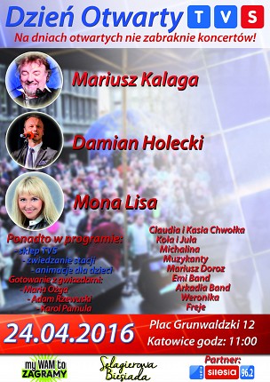 Już 24 kwietnia przy akompaniamencie znanych i lubianych gwiazd śląskiej sceny muzycznej (m.in. Mariusz Kalaga, Mona Lisa, Damian Holecki, Kola i Jula, Claudia i Kasia Chwołek) wszyscy chętni będą mogli zwiedzić Telewizję TVS i zobaczyć, jak wygląda codzienność pracujących w niej osób! Małe i duże studio, reżyserki, w których tworzy się programy od strony technicznej, a także możliwość spotkania z gwiazdami srebrnego ekranu znanymi z programów “My Wam to zagramy”, czy “Szlagierowa Biesiada” – to wszystko czeka na Was podczas Dnia Otwartego stacji TVS.