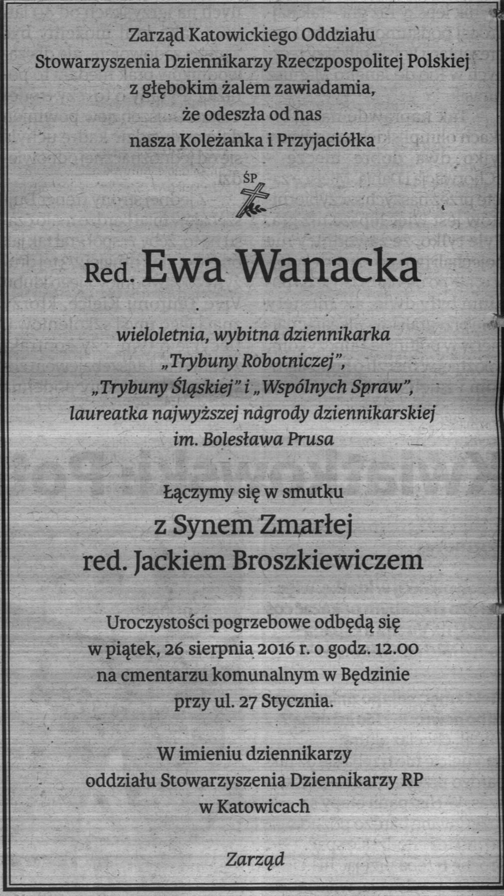 *) Tekst pochodzi z miesięcznika „Wspólne Sprawy” – czasopisma Katowickiej Spółdzielni Mieszkaniowej, nr 2 (191) z 2007. Tytuł i nadtytuł zmienione. Ewa Wanacka miała wówczas lat 80.