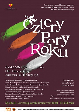 “Cztery Pory Roku” to spektakl charytatywny na rzecz młodych twórców, beneficjentów Fundacji Młodzi Twórcy im. prof. Piotra Dobrowolskiego. Spektakl ten zostanie zaprezentowany 6 kwietnia (środa) o godz. 18.00 w Klubie Old Timers Garage w Katowicach ul. Jankego 132. “Cztery Pory Roku” to spektakl słowno-muzyczny, oparty między innymi na tekstach Jeremiego Przybory oraz na piosenkach z “Kabaretu Starszych Panów”. Znani i lubiani dziennikarze i redaktorzy – Maria Zawała, Dorota Podlodowska, Krystyna i Wojciech Zamorski, prezenterzy telewizyjni i radiowi – Ewa Niewiadomska, Anna Sekudewicz, profesorowie katowickich uczelni – prof. Krystyna Doktorowicz, ludzie kultury – Maria Fox, Jerzy Ciurlok, Anna Dobrowolska – wszyscy zaśpiewają przeboje z lat 60-tych i 70-tych.