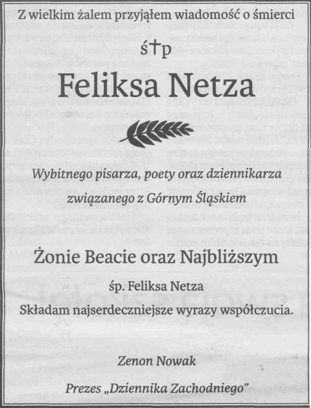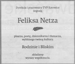 Środowisko literackie w Polsce i na Śląsku poniosło dotkliwą stratę. Feliks Netz był nie tylko poetą i to wybitnym, ale także pisarzem i tłumaczem literatury węgierskiej i rosyjskiej. Eugeniusza Oniegina przetłumaczył w sposób zachwycający. Dzięki niemu poznaliśmy twórczość Sandora Maraia. Teatr Śląski też poniósł wielką stratę. My osobiście straciliśmy przyjaciela, a teatr przewodniczącego Rady Programowej.