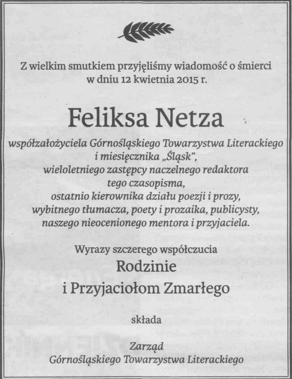 Maciej Melecki, poeta i redaktor z Instytutu Mikołowskiego, wspominał w 2009 r., jak w połowie lat 90. spotkał Feliksa Netza, starając się o publikację swoich wierszy w miesięczniku “Śląsk”: