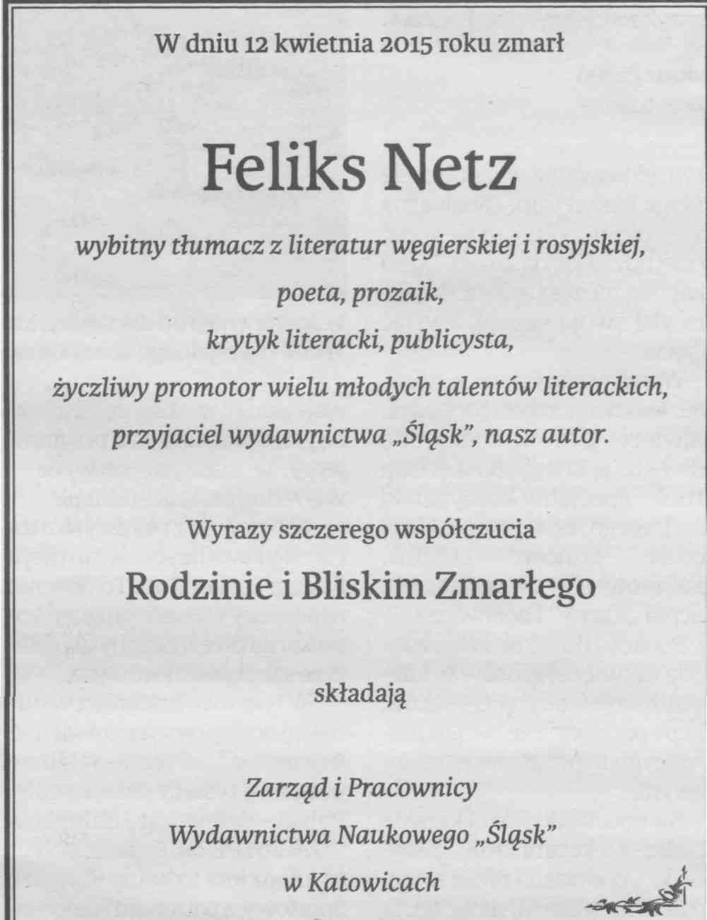 Feliks Netz nie żyje. W wieku 75 lat zmarł Feliks Netz, wybitny pisarz i poeta, związany ze Śląskiem i śląskimi mediami. Był także tłumaczem z języków węgierskiego i hiszpańskiego. Feliks Netz zmarł w Katowicach w niedzielę 12 kwietnia.