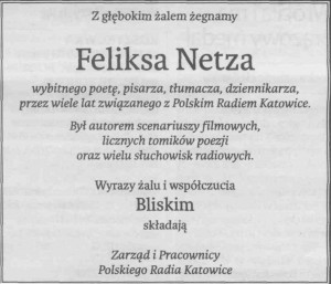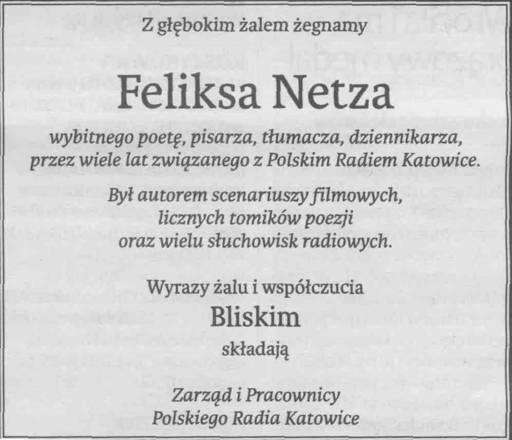 Miał 75 lat. Autor słuchowisk radiowych. Twórca m.in. słuchowiska “Pokój z widokiem na wojnę polsko-jaruzelską” o wydarzeniach w kopalni Wujek w stanie wojennym. Ukończył filologię polską na Uniwersytecie Śląskim. Był autorem scenariuszy do filmów, wydał liczne tomiki poezji. Odznaczony m.in. Złotym Krzyżem Zasługi oraz Brązowym Medalem “Zasłużony Kulturze Gloria Artis”. Jego felietony ukazywały się na naszej antenie m.in. w cyklu “dzień dobry panie Felku”. Feliks Netz jest też autorem książki “Róg Ligonia i Królowej Jadwigi” wydanej z okazji 70-lecia naszej rozgłośni.