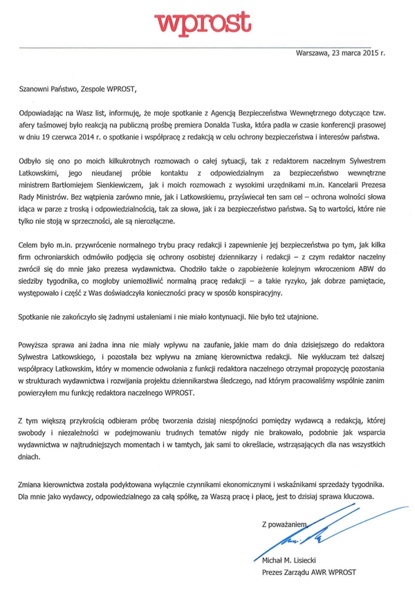 Wczoraj dziennikarze tygodnika “Wprost” (AWR “Wprost”), zaniepokojeni nagłą zmianą na stanowisku naczelnego, skierowali pismo do prezesa PMPG Polskie Media. Sugerowali w nim, że zwolnienie Sylwestra Latkowskiego może mieć związek “aferą podsłuchową”. – Powyższa sprawa nie miała wpływu na zaufanie, jakie mam do redaktora Latkowskiego – odpowiada im Michał M. Lisiecki.