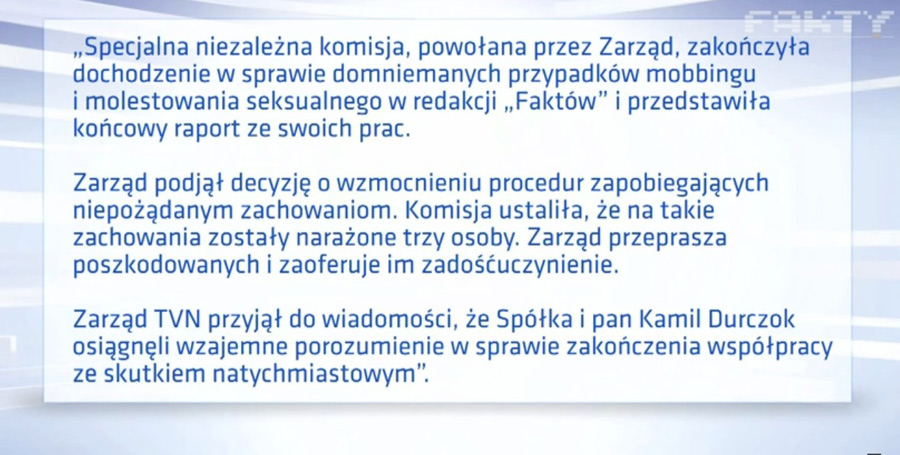 We wtorek stacja TVN wydała komunikat dotyczący zakończenia pracy niezależnej komisji zajmującej się mobbingiem i molestowaniem seksualnym w redakcji “Faktów” TVN. Oprócz stwierdzenia przypadków “niepożądanych zachowań” ogłoszono w nim, że TVN i Kamil Durczok (szef “Faktów”) “osiągnęli wzajemne porozumienie w sprawie zakończenia współpracy ze skutkiem natychmiastowym”. Podobnej treści komunikat zarządu stacji odczytano też widzom głównego wydania “Faktów”. Poza tym oświadczeniem stacja w żaden sposób sprawy już nie komentuje.