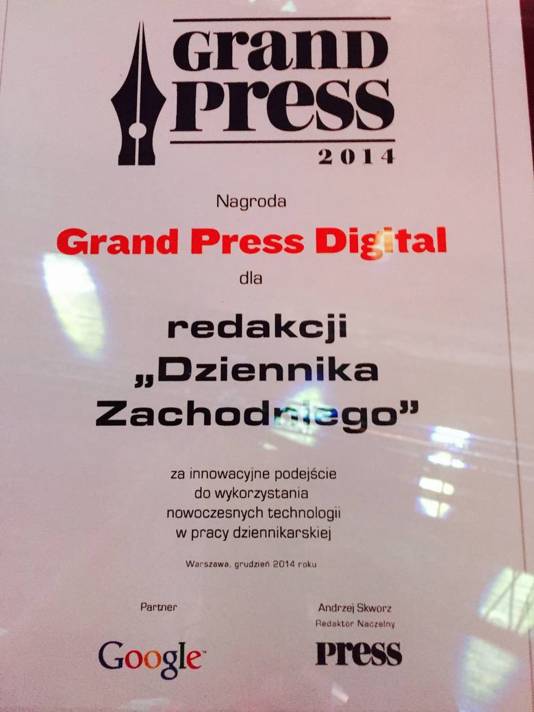 Redakcja Dziennika Zachodniego otrzymała nagrodę Grand Press Digital za wzorcowe wykorzystanie najnowszych narzędzi cyfrowych w pracy regionalnych dziennikarzy. Wyboru dokonano podczas uroczystej gali 11 grudnia.